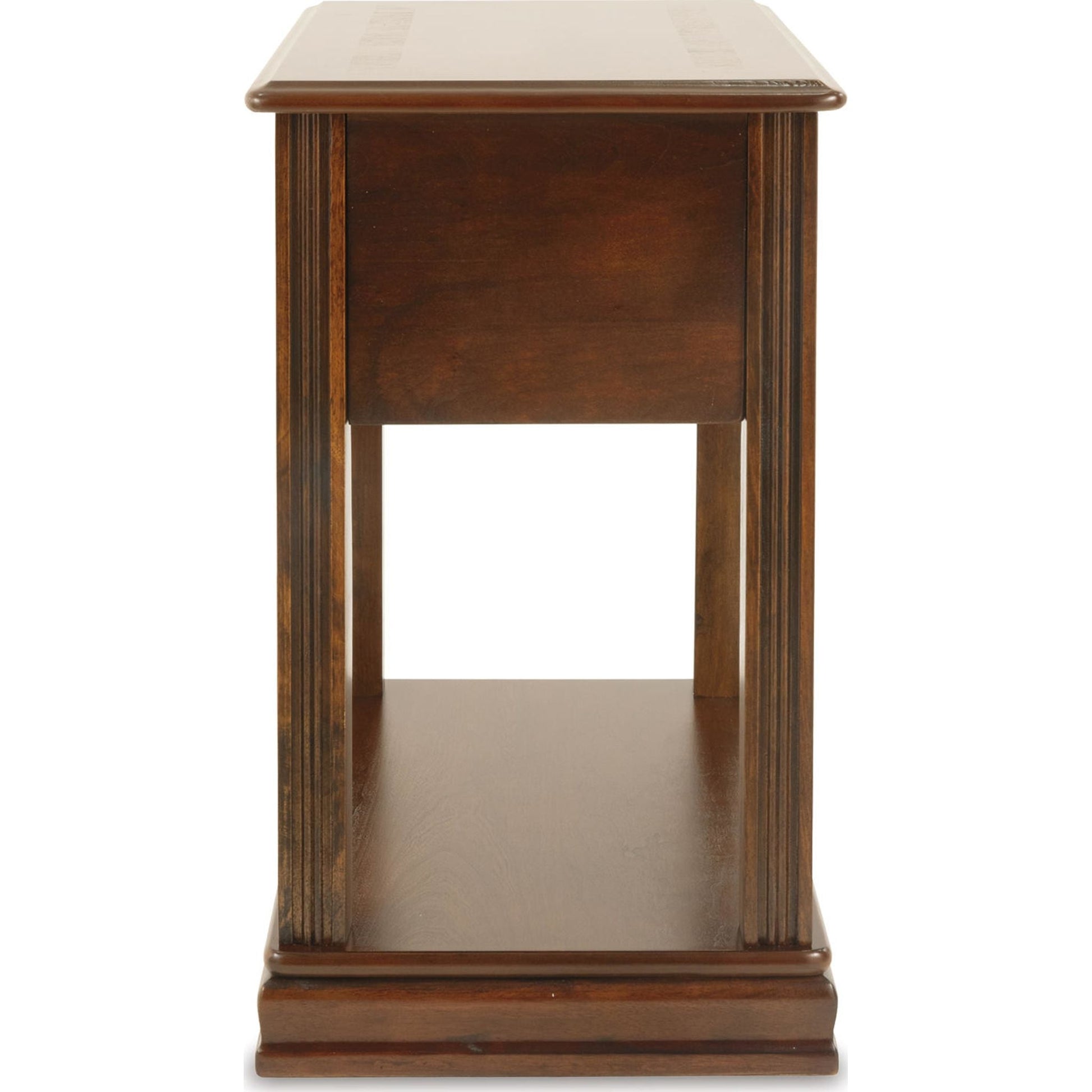 Des incrustations, des détails cannelés et un effet huilé sur la finition riche confèrent à cette table d'appoint un caractère exceptionnel. L'étagère inférieure est idéale pour accueillir un panier de rangement, un vase décoratif ou tout autre objet décoratif. Vous apprécierez également le tiroir profond avec plateau amovible, offrant un espace de rangement pratique.